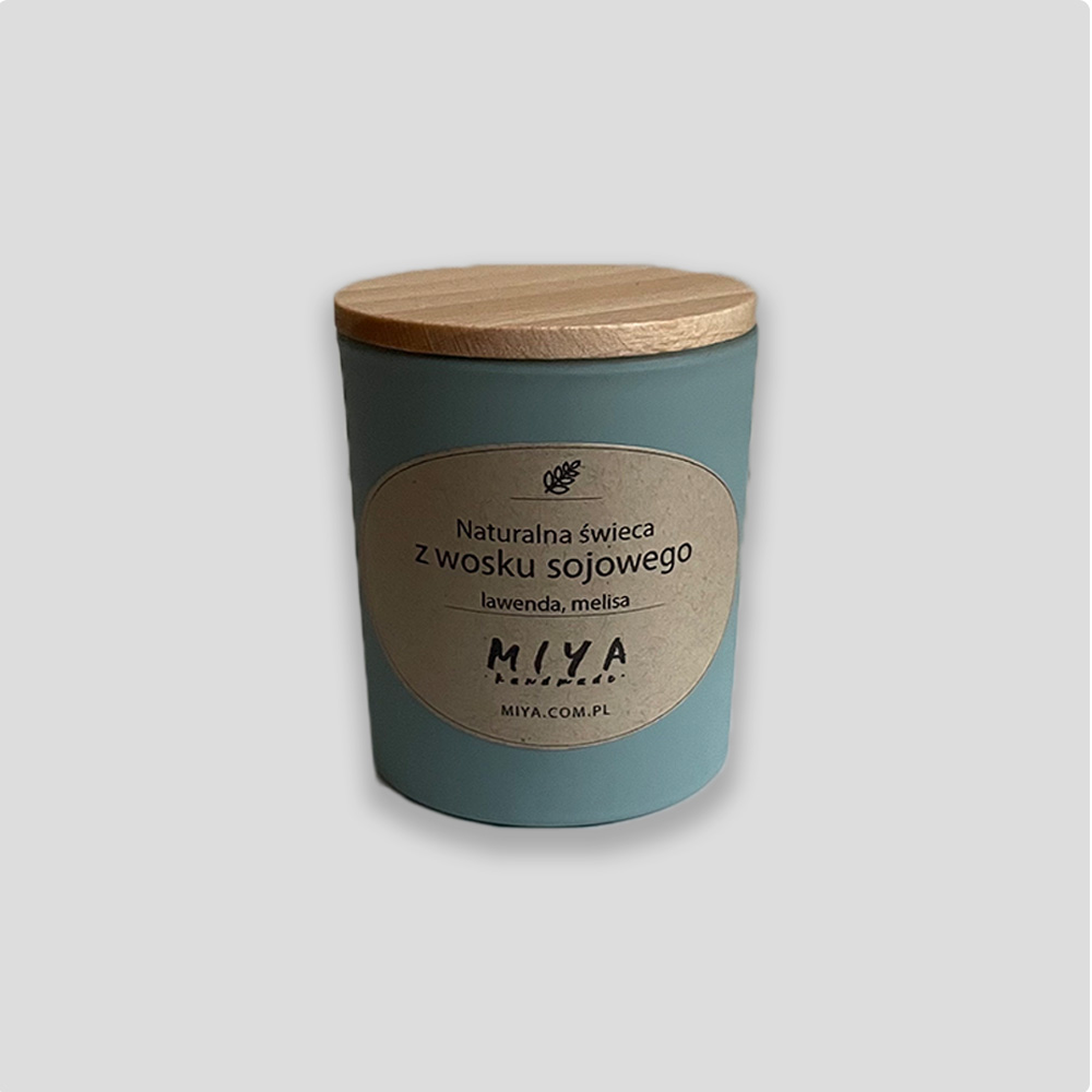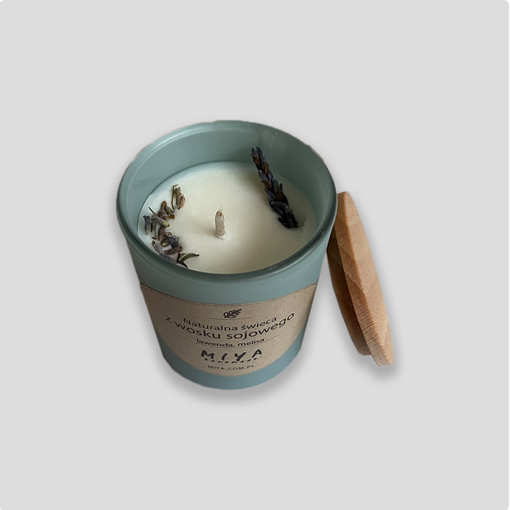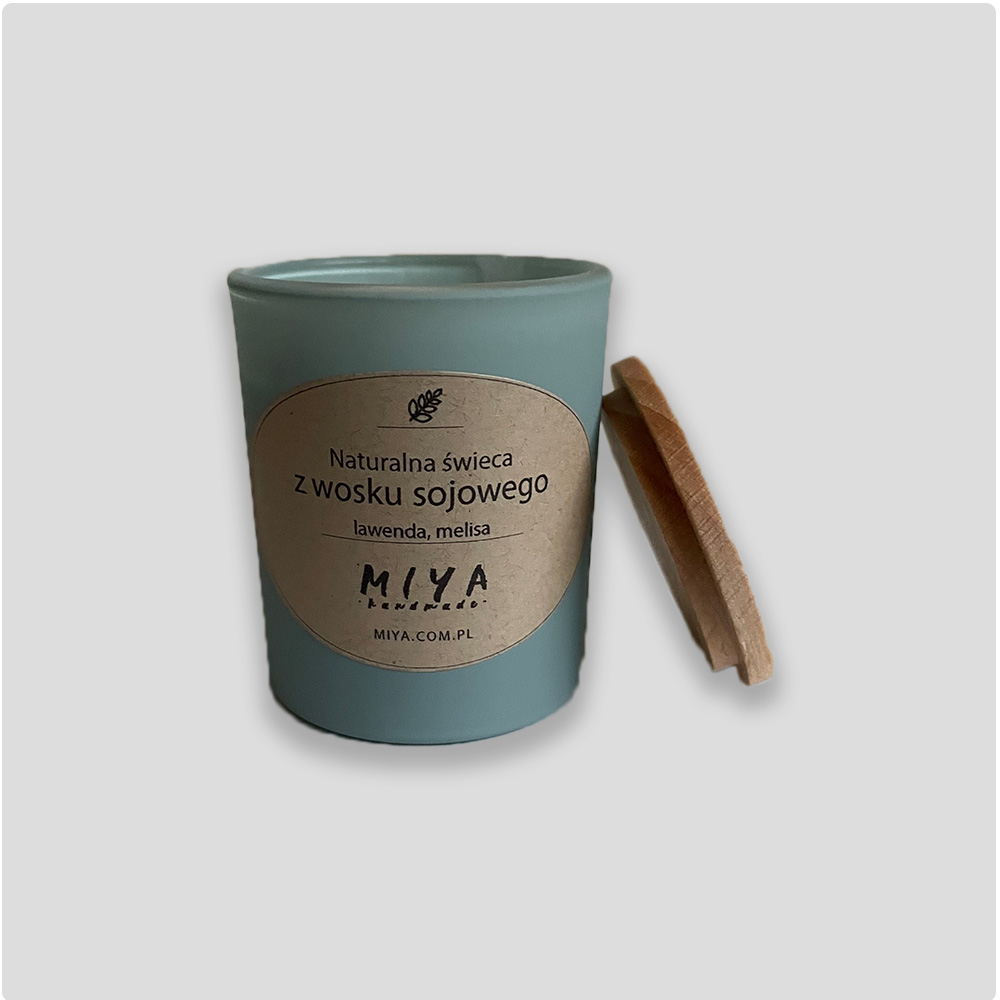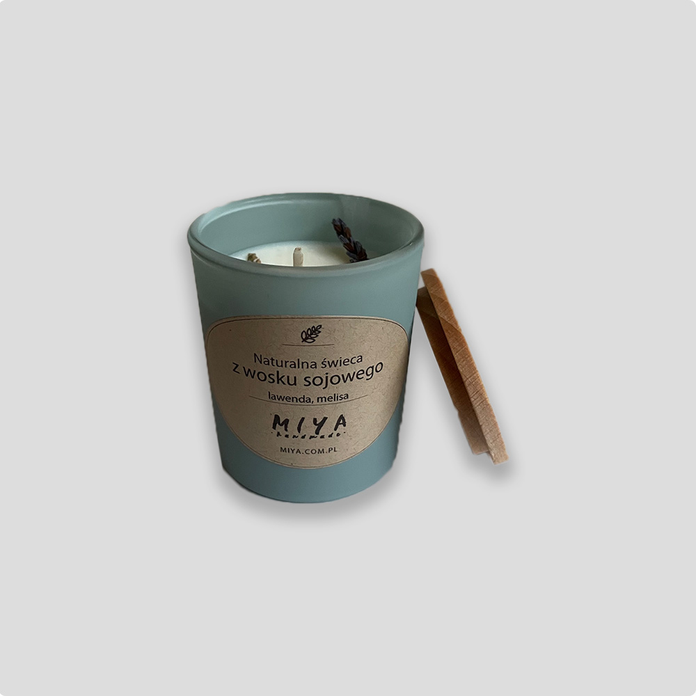 Wykonana ręcznie, naturalna świeca z wosku sojowego, z bawełnianym knotem ekologicznym zaimpregnowanym naturalnym woskiem, wzbogacona kompozycją naturalnych olejków eterycznych: lawenda i melisa