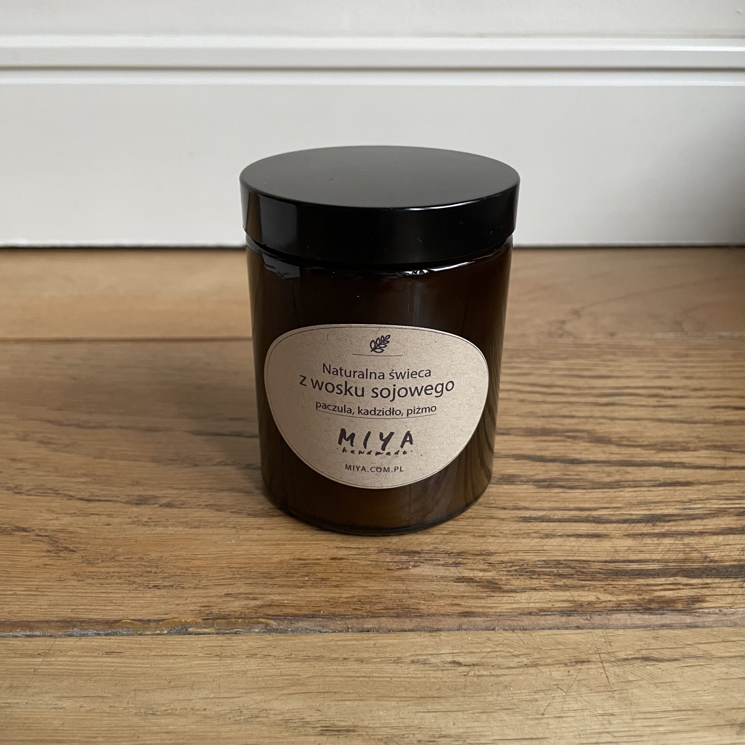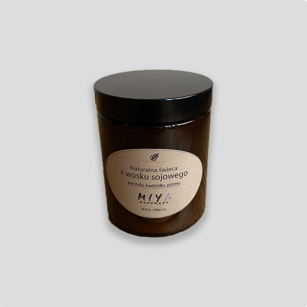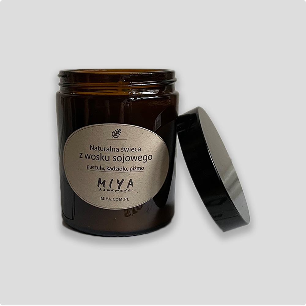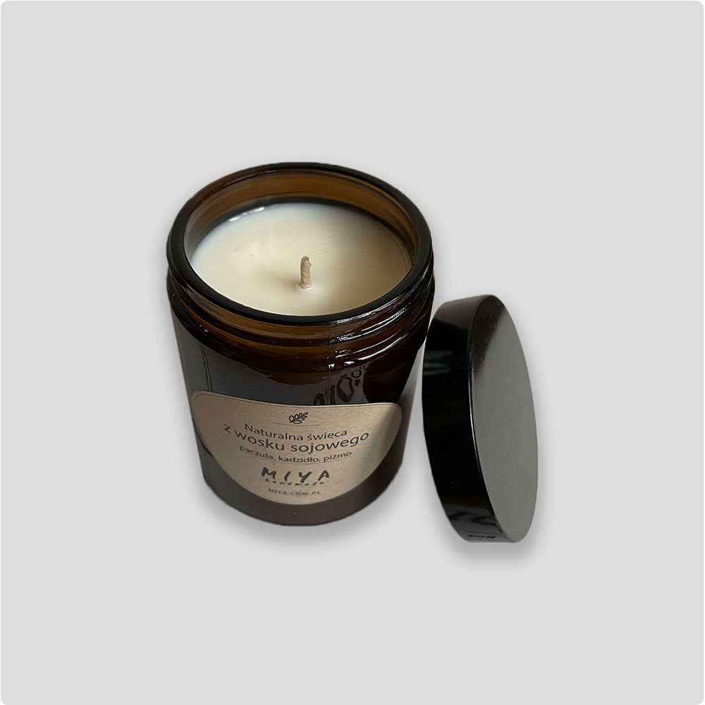 NATURALNA ŚWIECA Z WOSKU SOJOWEGO – PACZULA, KADZIDŁO, PIŻMO